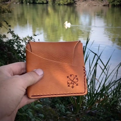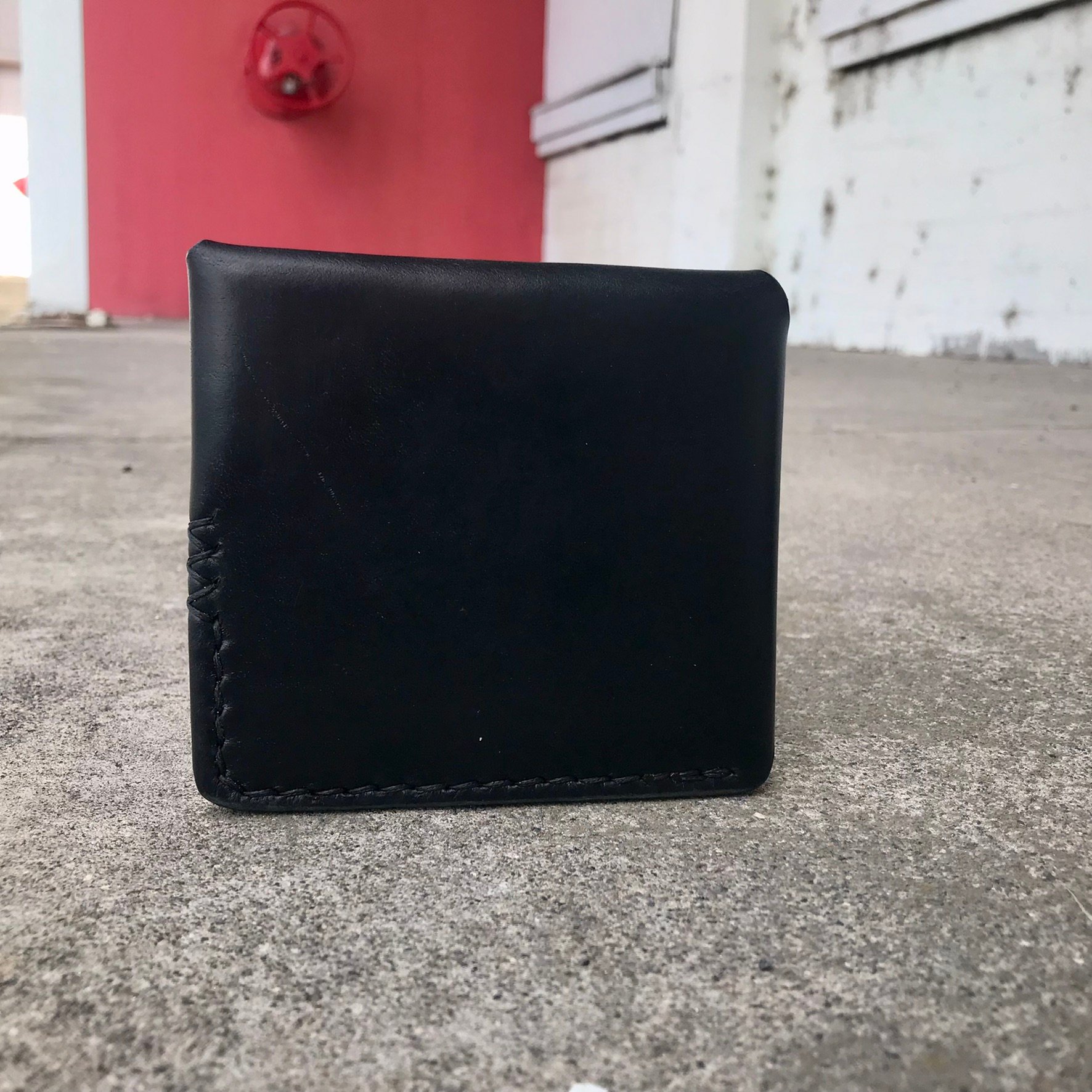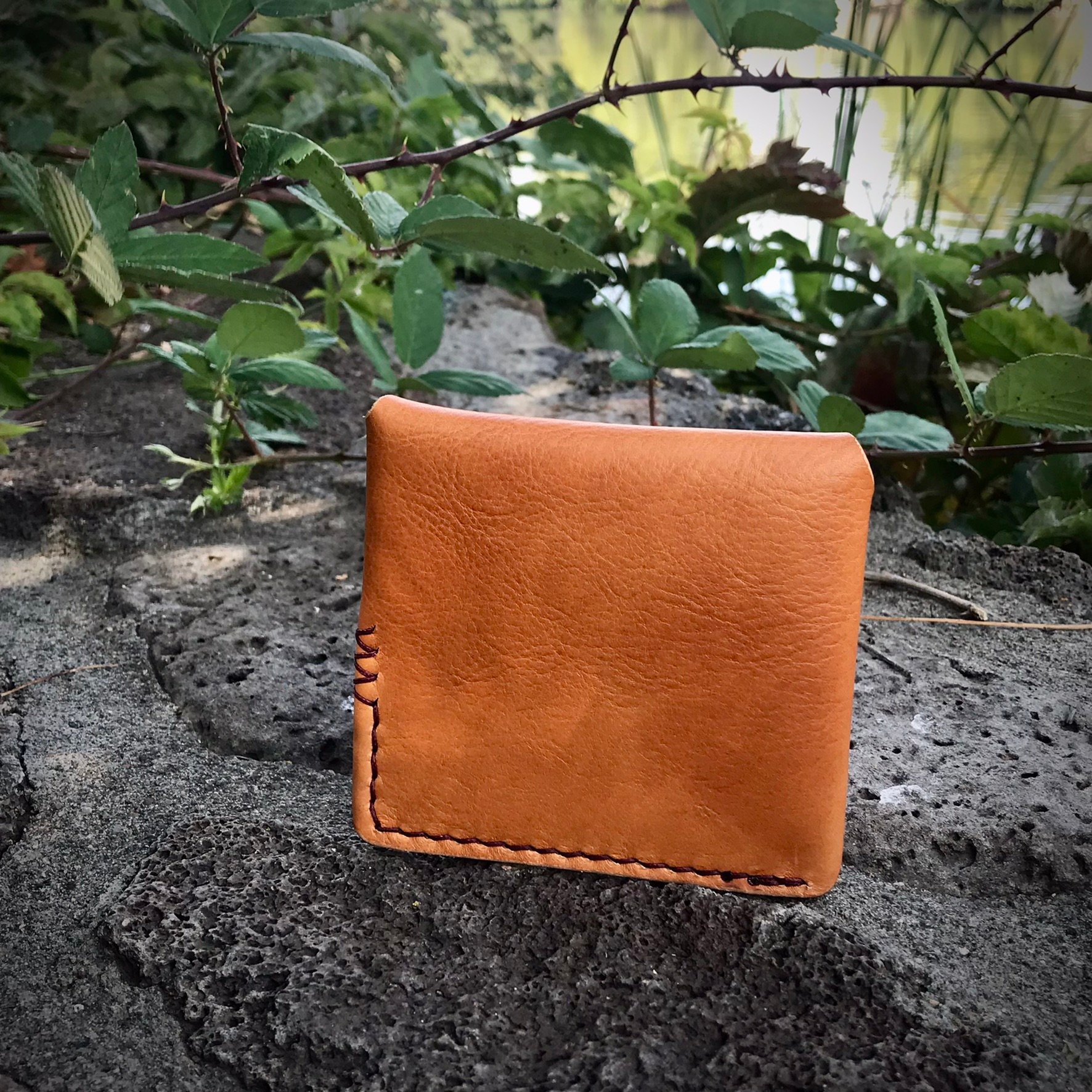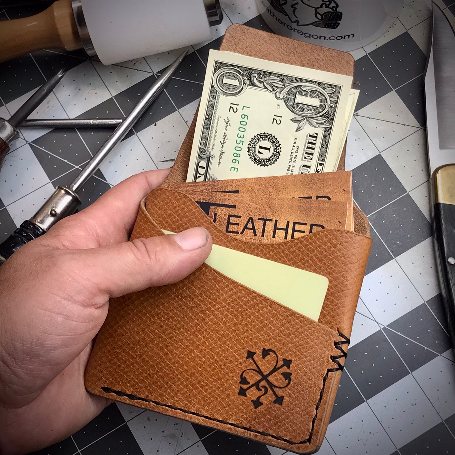 Almost a square. This is roomy on the inside while staying unobstructive on the outside. The version of this one with rivets is Lucas' personal carry. Takes a dozen cards, and bills can be stored as seen in a couple pictures. He puts his most used card in the front pocket where the lid tucks (also pictured) and the rest hangs in the middle with cash in the back. Big storage in a little package, and, as with the other two "envelope" style wallets we offer, able to securely keep a lid on things.