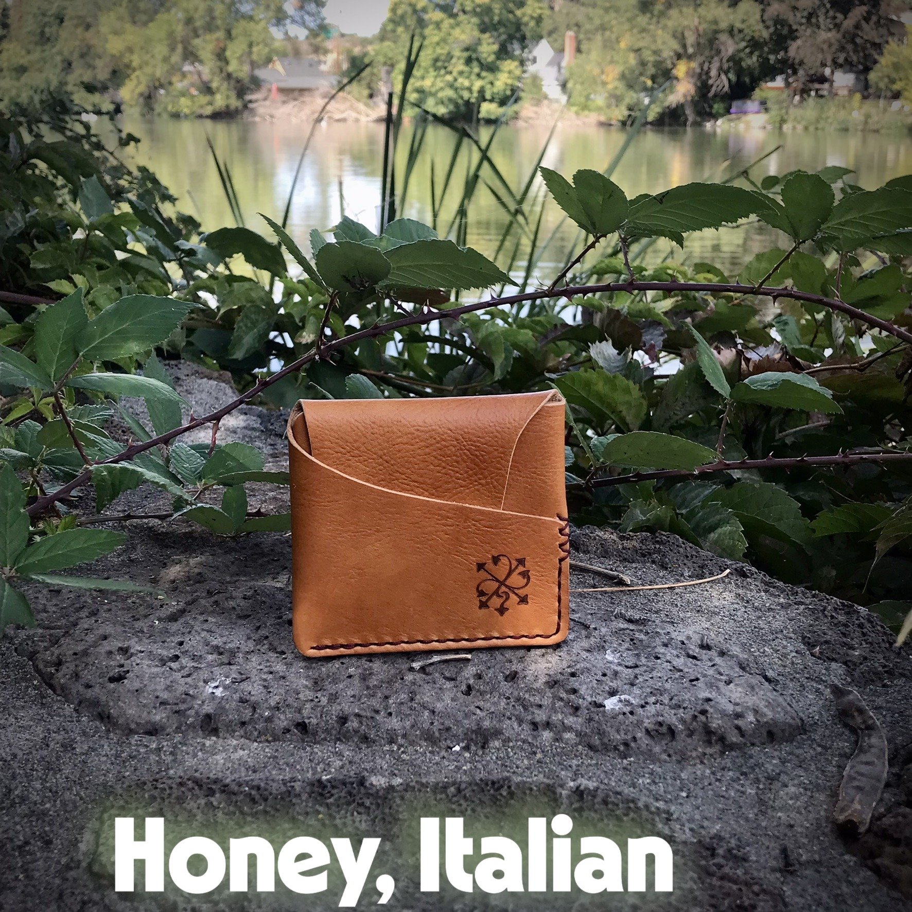 Honey, Italian: 4/5 oz Conceria La Bretagna. Supple and so so nice feel. Will stretch to fit more and more.