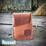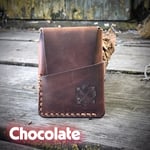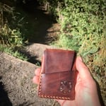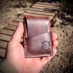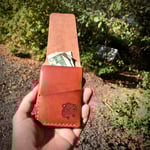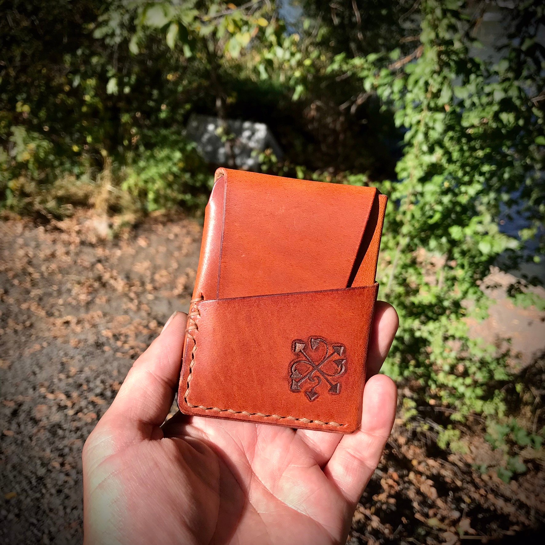 Minimalist size with maximalist function. Constructed form a single piece of leather, folded around itself to create a main inner pocket large enough for multiple cards or cash, a back pocket, and a front pocket for the lid to tuck in. Most popular use is as a wallet but is also commonly used for business cards, rewards/punch cards, etc. Quarter folded cash will fit into any of the three pockets.